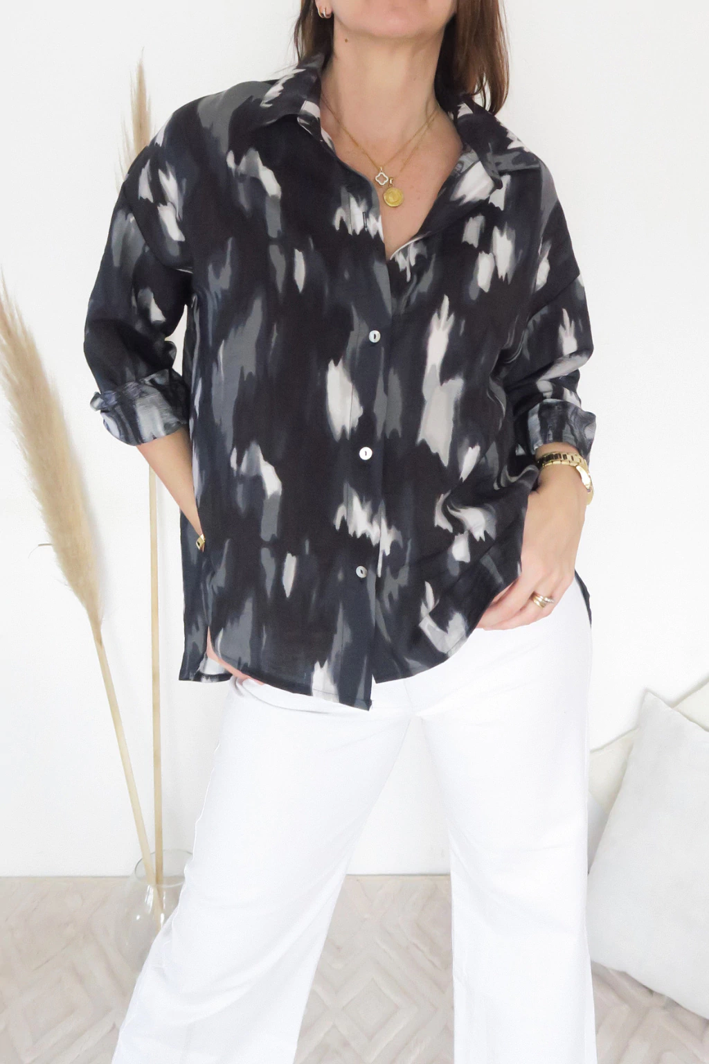 Camisa simil sedita arrugada, con mucha caída. Corte irregular más larga atrás.