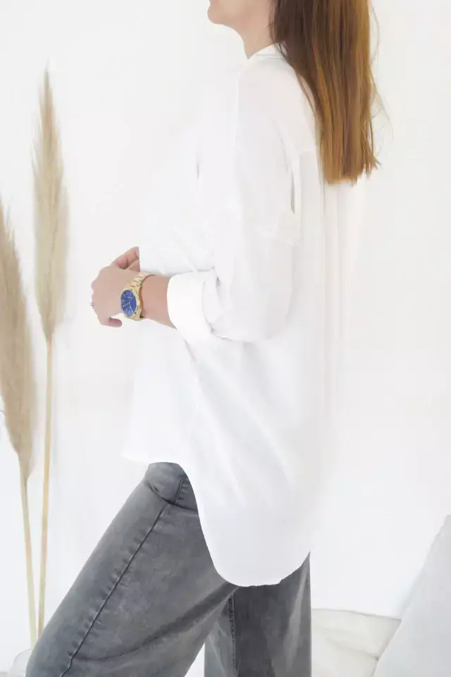 Camisa de cey, con mucha caída. Clásica, corte amplio, con tabla en la espalda. Más largo en la espalda que en el frente.