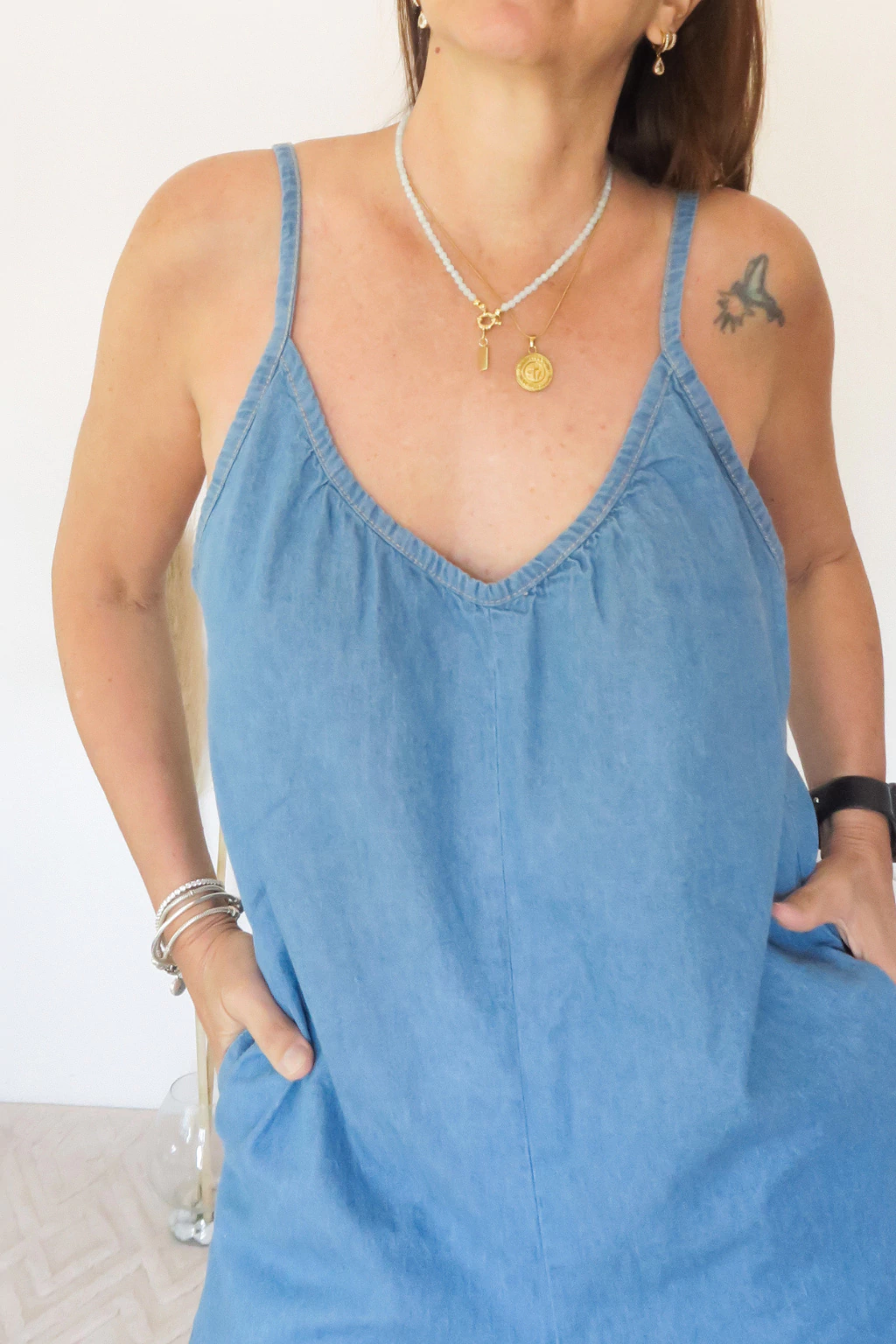 Su tejido de jean resistente y de alta calidad asegura durabilidad y fácil mantenimiento, ideal para el uso diario o salidas casuales. Además, cuenta con bolsillos funcionales, perfectos para llevar tus objetos personales con comodidad y estilo.
