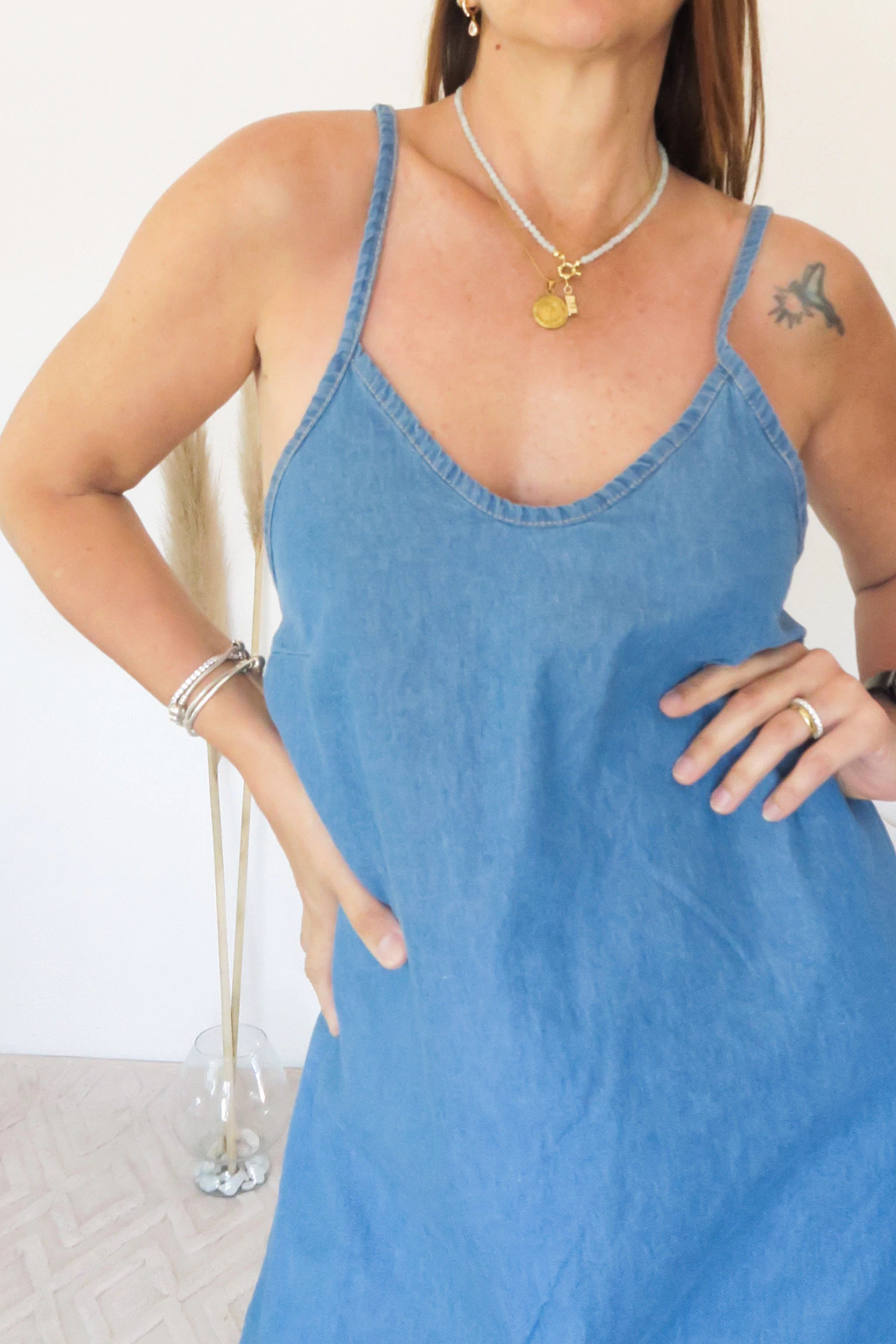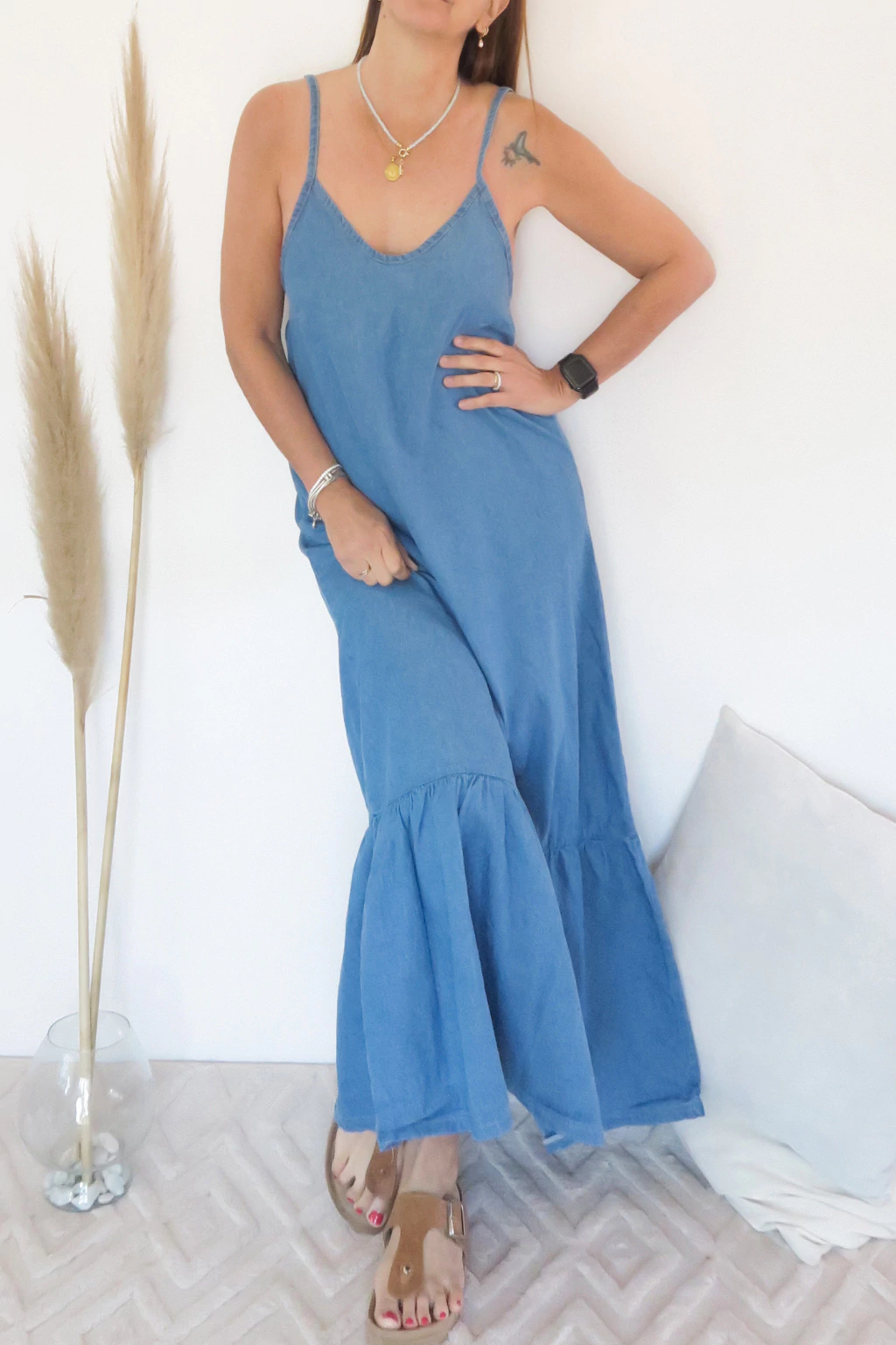 Vestido Tulum: un diseño elegante y cómodo, confeccionado en jean de alta calidad. Su corte solero y evasé realzan la figura, mientras que el elástico en el escote (espalda) brinda un ajuste perfecto. El volado en el ruedo añade un toque sofisticado y delicado, ideal para ocasiones especiales. Combina estilo y confort en un vestido largo que no puede faltar en tu guardarropa.